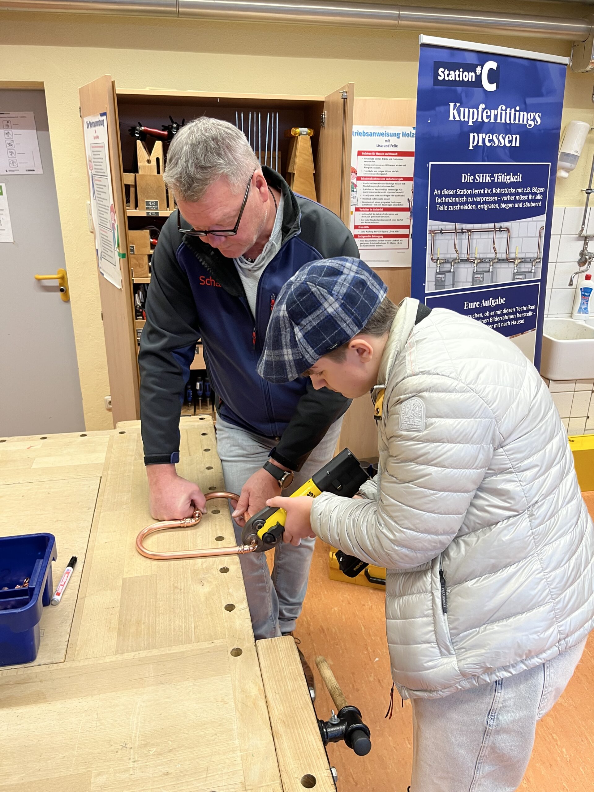 Im Fach Berufsorientierung präsentieren wir an Schulen zusammen mit Handwerkspartnern und ihren Junggesellen und aktuellen Lehrlingen den Ausbildungsberuf „SHK-Anlagenmechaniker“. Dort lernen Schüler ganz praktisch, mit ihren Händen zu arbeiten und zu denken. Vier Stunden lang kann jeder Teilnehmer schneiden, stecken und pressen (manchmal sogar schweißen und Spezialwerkzeuge ausprobieren). Grundsätzlich wird immer auch eine Fußbodenheizung verlegt und per CAD-Software ein Badezimmer geplant. Immer wieder mal werden auch simulierte Verstopfungen in Abwassersystemen per Endoskopkamera geortet und beseitigt oder mithilfe einer AR-Brille eine Heizungsanlage digital repariert. Zwischen den einzelnen Stationen werden Vorbehalte gegenüber Handwerksberufen diskutiert (und meist entkräftet), die besonderen Vorteile des SHK-Berufs als Lebensmodell vermittelt sowie auf die guten Möglichkeiten zur Fort- und Weiterbildung im Handwerk nebst Karrieremöglichkeiten hingewiesen – so auch an der Elisabeth-Selbert Gemeinschaftsschule in Bad Schwartau. An den bisherigen Handwerker-Livestunden an dieser Schule nahmen 16 Schüler teil, von denen sich fünf anschließend für ein Praktikum im teilnehmenden Betrieb Fa.Otto Schatte GmbH interessierten.